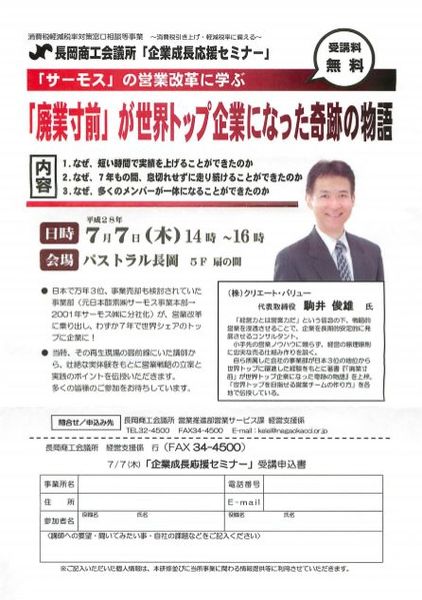 - 2016.07.07:【新潟・長岡商工会議所】7月7日 「廃業寸前」が世界トップ企業になった奇跡の物語